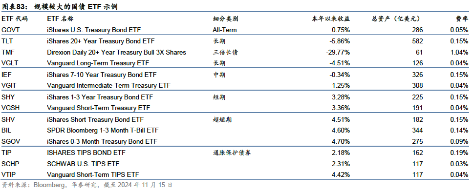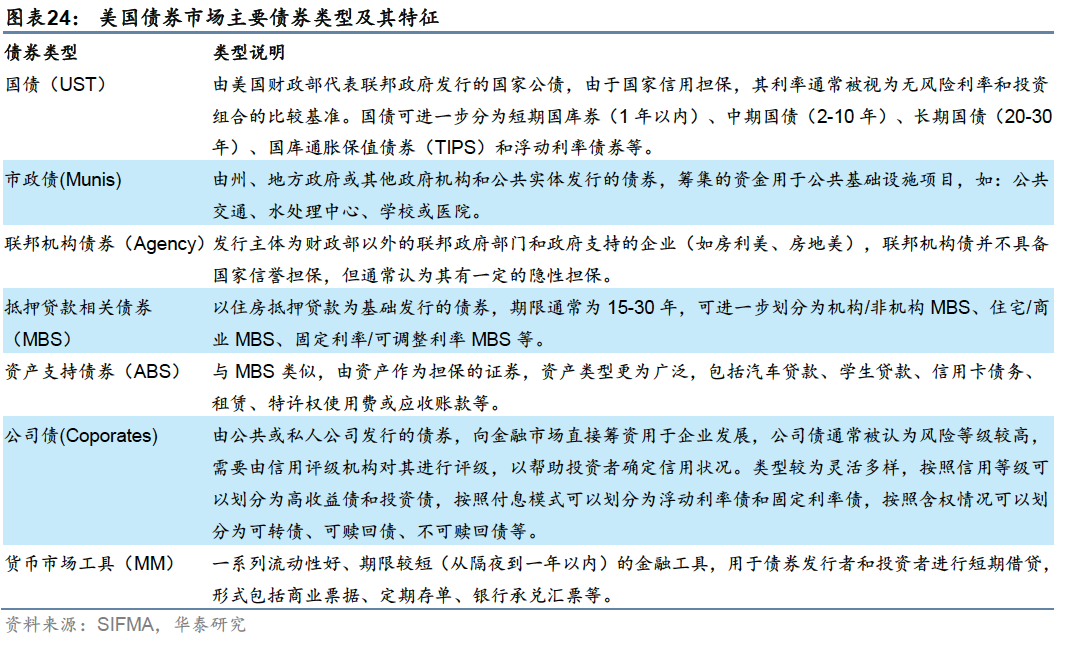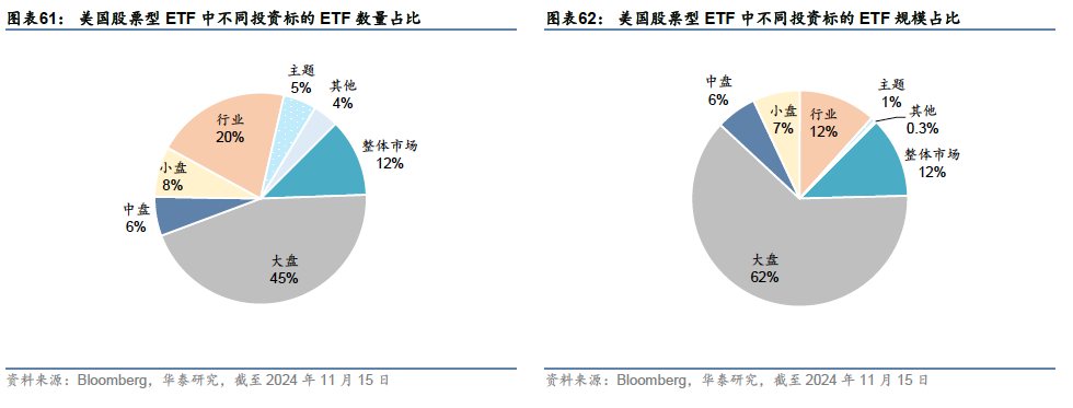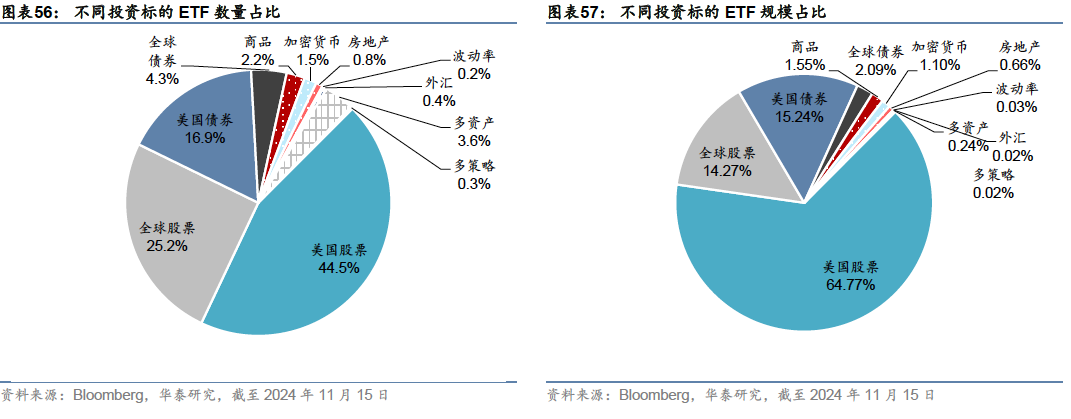 本文为华泰金工海外产品研究系列第二篇,介绍美国资本市场、资管管理行业和ETF产品。美国拥有全球规模最大的股票和债券市场:2023年底,上市美股总市值约49万亿美元,占全球股票市值42.6%;债券市场规模约55.3万亿美元,占全球债券市场总规模的39.3%。美国受监管基金类似国内口径下“公募基金”,其下产品类型以共同基金(类似“场外开放式基金”)和ETF为主,合计占比约99%。近年来,公募行业投资理念向被动转型,ETF规模增高于共同基金,成为美国家庭主要投资工具。截至2024年11月15日,美国ETF市场产品超3700只,规模超10万亿,其中境内股票型ETF占比约65%,其次为全球股票和境内债券,各自占比约15%,另外5%为海外债券、商品等另类资产ETF,提供特殊资产类型和特殊策略的风险敞口,服务于投资者多样化投资需求。 资本市场现状:全球规模最大的股票和债券市场 2023年底,上市美股总市值约49万亿美元,占全球股票市值42.6%,日均成交额约5146亿美元;债券市场规模约55.3万亿美元,占全球债券市场总规模的39.3%,日均成交额约10758亿美元。股票市场以纽交所和纳斯达克两个交易所为主导,分别侧重传统行业蓝筹股和新兴科技股,机构化程度较高,养老金和共同基金是主要机构参与力量;债券市场中,国债市场增速较快,一级发行、二级成交和存量规模均在7种类型债券占主导地位,持有者结构多元,获外资广泛持有。衍生品市场以CME和CBOE等四大交易所集团为主导,场内品种覆盖股票、利率、商品、外汇、波动率等各类资产。 资产管理行业:ETF成为美国家庭参与资本市场投资的重要工具 美国资管行业包括注册投资公司、监管豁免机构、集合投资基金和独立管理账户四种类型,其中注册投资公司类似国内口径下的“公募基金”,截至2023年底规模约33.93万亿美元。历史上,公募基金的行业的发展经历了从封闭式基金到共同基金(类似国内口径下的场外开放式基金),再到ETF的发展历程,目前共同基金和ETF是主流产品形态,2023年底规模占比分别为75%和24%。ETF近10年增速显著超过共同基金,公募基金行业在产品形态和投资理念上的发展趋势呈现出两个鲜明的特征:1:投资理念从主动投资向被动投资转变;2:产品形态从共同基金向ETF拓展。 ETF产品:以宽基股票为基石,“万物”皆可ETF 2023年底,上市美股总市值约49万亿美元,占全球股票市值42.6%,日均成交额约5146亿美元;债券市场规模约55.3万亿美元,占全球债券市场总规模的39.3%,日均成交额约10758亿美元。股票市场以纽交所和纳斯达克两个交易所为主导,分别侧重传统行业蓝筹股和新兴科技股,机构化程度较高,养老金和共同基金是主要机构参与力量;债券市场中,国债市场增速较快,一级发行、二级成交和存量规模均在7种类型债券占主导地位,持有者结构多元,获外资广泛持有。衍生品市场以CME和CBOE等四大交易所集团为主导,场内品种覆盖股票、利率、商品、外汇、波动率等各类资产。 股票型ETF:低成本、高精度刻画风险敞口 股票是美国ETF市场最重要的投资标的。截至2024年11月15日,股票型ETF在美国ETF市场中规模占比约79%,其中大部分投向境内股票。国内产品以宽基ETF和Smart Beta ETF为主,标普500相关ETF规模超2.2万亿美元;行业、主题和个股等ETF为辅;近年来股票+期权类衍生品ETF逐渐兴起。海外主要投向综合性全球市场、非美发达市场、新兴市场,也有部分主题产品,以及投向单一国家或地区的地域产品。 债券型ETF:获取债券市场平均收益的便捷之选 截至2024年11月15日,债券型ETF规模占比约17%,其中美国债券15%,全球债券2%。美国债券中规模最大的是两个综合型债券ETF,涵盖多种债券类型和到期期限。由于债券市场类型丰富、数量庞大,个券研究成本较高,投资综合型债券ETF可作为低成本获取债券市场平均收益的便捷之选。单一类型债券以国债和公司债为主,近年来免税市政债受关注较多。海外债券ETF主要投向综合性全球债券市场,投向单一国家或地区的债券产品较少。 本文研究导读 本文为华泰金工海外产品研究系列第二篇。本系列研究旨在介绍全球多个金融市场,从中寻找丰富多样的可投资产品,进而筛选优质标的,构建全球投资组合,满足投资者的跨境资产配置需求。 美国是全球资本市场中最大、最重要的组成部分之一:第一是体量最为庞大,拥有全球规模最大的股票和债券市场,多层次资本市场与经济发展有机结合,实体经济和金融市场体量均居于全球首位;第二是资产类型多样,涵盖丰富的股票、债券、衍生品等资产类型,以及大量的共同基金、ETF等投资产品,并形成了与之配套的场内、场外等多样化的交易场所、交易机制和规范的监管措施,为金融投资提供了良好的土壤;第三是投资理念较为先进,资产管理领域的投资研究方法和产品设计理念引领全球资管行业,对于投资者构建全球资产配置组合具备重要参考意义。 关于美国市场的研究将由浅入深逐步展开。第一章将介绍股票、债券和衍生品市场现状,包括市场规模、交易活跃程度、主要交易场所、主流交易品种,市场参与者构成,为投资者了解资本市场和产品类型提供参考。第二章将从资产管理的视角展开,重点介绍美国共同基金行业的规模和发展趋势、主导产品类型、前沿发展方向等;第三章将梳理美国ETF市场丰富的产品线,前沿发展趋势,服务于投资者多样化投资需求。