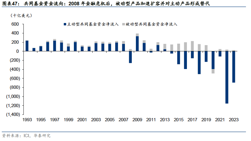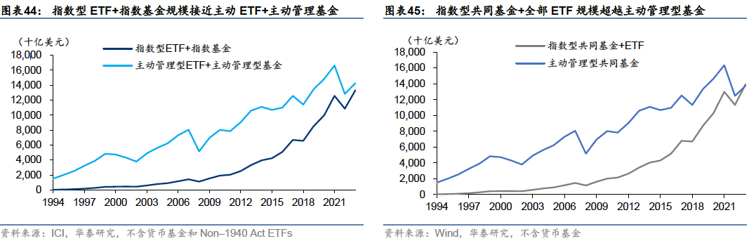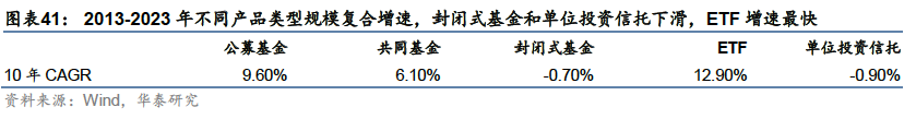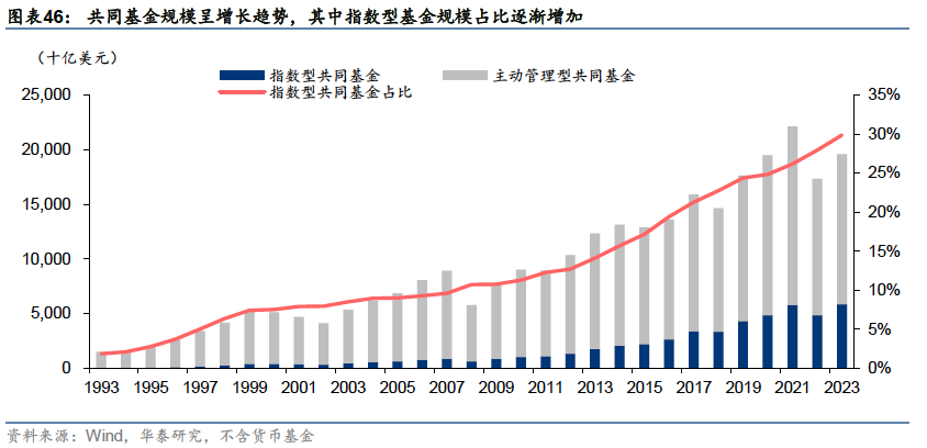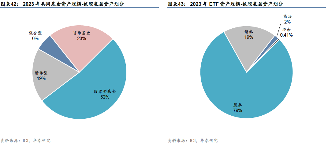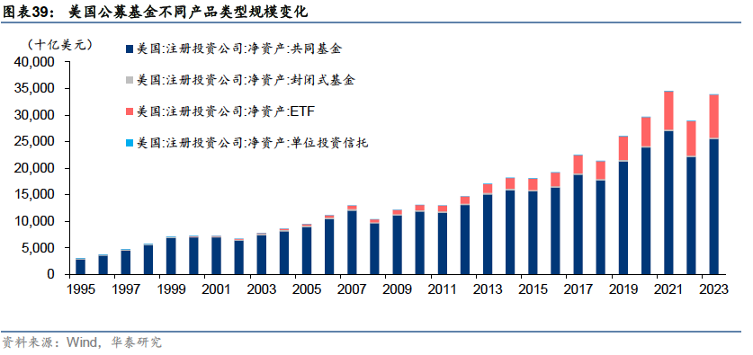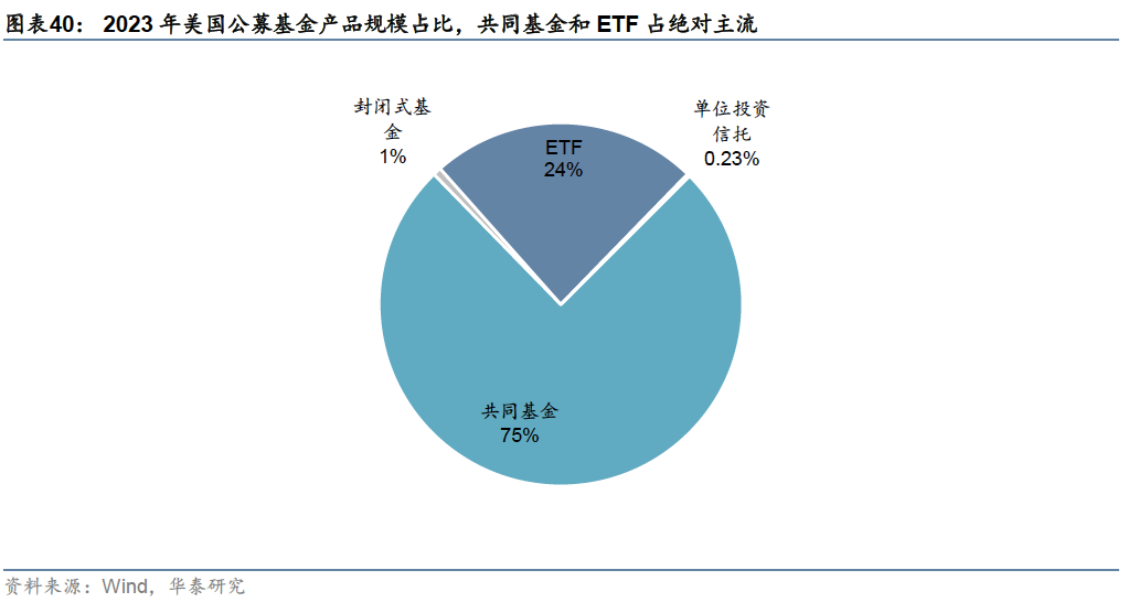 被动管理规模占比增大,ETF兴起并快速发展 发展历程:从封闭式基金到共同基金,再到ETF 资管行业起步初期以封闭式基金为主,随着资本市场的发展,共同基金行业兴起,股票型、债券型、混合型和货币型基金产品陆续出现并随资本市场扩容;1990年代后,投资理念向被动投资转型,ETF产品出现并逐渐成为主流。 1907年至1929年:资管行业起步,前期以封闭式基金为主:集合资产管理模式最早起源于英国,1907年,美国开始引进英国的投资基金制度,第一只封闭式基金——波士顿个人财产信托(Boston Personal Property Trust)成立。由于封闭式基金可以加杠杆,能大幅提升持有人收益,因此在美国股市快速上涨的1920年代,封闭式基金成为主流。1924年,第一支共同基金——马萨诸塞投资者信托基金(Massachusetts Investors Trust,简称MIT)也成立于这一阶段。 1929年至1990年:监管趋于完善,共同基金行业兴起,养老体系改革叠加经济转型带动基金业扩容:1929年的股市崩盘和大萧条对基金业造成了严重打击,随后政府加强了对整体金融行业的监管,为基金业的健康发展奠定了基础。1945至1970年,二战后美国制造业复兴,带动相关股票价格上涨,股市繁荣,基金市场扩容,共同基金行业兴起,诞生了富达、普信、先锋领航、伯克希尔等专业资产管理机构。 1970年代,由于大通胀导致的经济衰退,资本市场和基金业发展陷入停滞,货币基金在这一时期扩容,一度成为资管行业的主要产品。1980年代初到1980年代中期,通胀问题得到解决后,美国利率水平回落,带动美债市场进入牛市,债券型基金扩容。1980年代中后期,随着美国利率实现自由化,利率水平有所抬升, 1986年后债券型基金比重逐步回落。同时,美国经济重心由传统制造业向高端制造业和服务业转型,带动了经济的回暖和个人财富的增加,家庭财富通过共同基金向股票市场转移,共同基金业进入股票基金时代。至此,美国基金行业完成了股票型、债券型、混合型和货币型基金的快速增长。 这一时期,美国养老体系改革为资管行业带来了大量长期资金:1974年《雇员退休收入保障法案》和1978年创立401(K)条款,推动了雇主养老金计划和个人退休账户(IRA)的快速发展。这些改革措施使得大量资金通过直接投资或共同基金间接投资流入资本市场,成为推动美国股票市场和基金行业发展的重要资金来源。 1990年至今:被动投资和ETF兴起,并逐渐成为市场主流:1990年代后,指数基金特别是ETF开始崛起,投资风格和产品设计理念向被动投资转变。1993年美国证券交易所推出了全球第一只跟踪标普500指数的ETF——标准普尔存托凭证SPDR,2000年之后全球ETF进入快速发展期,债券、货币、商品等类型的ETF相继诞生。2008年金融危机后,被动型产品加速扩容并对主动产品形成替代,至2023年底,ETF和指数型共同基金规模超越主动管理型共同基金,被动投资逐渐成为资管市场的主流。 ETF兴起并发展壮大,成为美国家庭重要投资工具 近年来,美国资管行业在产品形态和投资理念上的发展趋势呈现出两个鲜明的特征:1:投资理念从主动投资向被动投资转变;2:产品形态从场外的共同基金向场内的ETF扩展。 从管理规模来看:共同基金内部,指数型产品占比逐年上升,至2023年末达到30%左右。所有公募基金中,指数型产品(含ETF和共同基金)规模逐渐接近主动管理型产品(含ETF和共同基金),在2023年均达到13万亿美元左右,规模基本持平;ETF和指数型共同基金合计规模在2023年底超越主动管理型共同基金,被动投资和ETF投资成为资管行业主流。