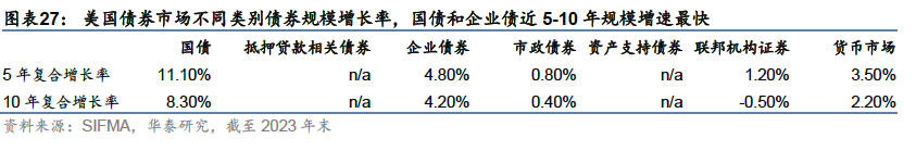 从存量规模和占比来看,截至2023年底,美国债券市场整体规模超44万亿美元(不含ABS和MBS),其中,国债规模超过26万亿美元,在债券市场中规模占比超45%(含ABS和MBS,以2021年底规模计),是规模最大的债券类别。国债规模的上升得益于2020年以来的宽松政策,近五年国债规模复合增长率达11.10%;截至2023年底,企业债规模约10.74万亿美元,占比19%,近五年复合增长率4.80%,近年来规模增速显著超过国债以外其他类型的债券。
