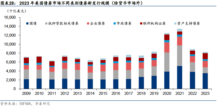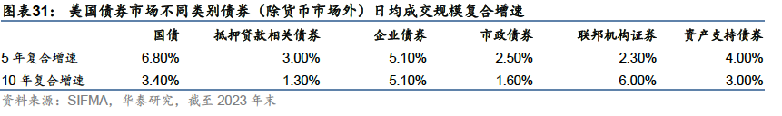 场外交易为主,国债日均成交规模最大约7600亿美元 从发行规模来看,近五年来新发行债券以国债、抵押贷款相关债券、企业债券为主。2020-2021,新发债券规模较往年快速提升,2020年相比2019年,各类型总计新发债券规模增长50%,2022-2023年有所回落。