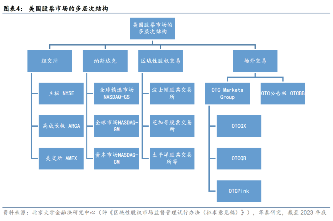 纽约证券交易所(NYSE):历史悠久、最具影响力的证券交易所:纽交所位于纽约市,最早诞生于1792年的《梧桐树协议》,是美国较早成立的交易所之一。纽交所上市企业以金融、能源、消费等传统行业蓝筹股为代表。在与纳斯达克的竞争中,纽交所内部也逐渐形成了三个层次:主板、中小板和高增长板,服务于不同规模和需求的企业。纽约证交所综合指数(NYA.GI)衡量在纽约证券交易所上市的所有普通股(含境外公司)的表现,截至2024年10月31日,该指数共包含1931只成分股,总市值约42.2万亿美元。行业覆盖金融、消费、医疗保健、工业、信息技术等行业,典型企业包括伯克希尔、摩根大通、贝莱德、黑石等金融企业,沃尔玛、宝洁、丰田等消费企业,通用、波音等工业企业,以传统行业蓝筹股为主。 纳斯达克(Nasdaq):第一个全球电子交易市场,美国最大的电子交易平台:纳斯达克市场成立于1971年,全称为全国证券交易商协会自动报价系统(National Association of Securities Dealers Automated Quotations),是世界上首个电子股票交易所。目前,纳斯达克市场内部共划分为三个层次:全球精选市场、全球市场和资本市场,不同层次使用不同的上市准入标准,分别吸引大型蓝筹企业、中型企业和小微企业。纳斯达克综合指数(IXIC.GI)包含所有在纳斯达克市场上市的公司,截至2023年10月31日,该指数一共包含3436只成分股,总市值约34.8万亿美元。行业市值分布上,信息技术行业一支独大,占比超60%。典型上市公司包括苹果、亚马逊、谷歌、Meta、微软、英伟达和特斯拉等科技巨头,这七家企业总市值约18.5万亿美元,占据纳斯达克市场的半壁江山,拼多多、京东、百度等境内互联网企业也在纳斯达克交易所上市。 二级市场成交相比一级市场发行较为分散,2023年,纽交所和纳斯达克成交量合计占比约40%。上市公司股票可以在场内或场外进行交易,场内活跃的证券交易所共有16个,主要来自三个集团:洲际交易所集团、纳斯达克集团和芝加哥期权交易所集团。根据芝加哥期权交易所集团(CBOE)的统计,2023年,约六成的上市公司股票交易通过这16个交易所完成,其中纽交所和纳斯达克占主导地位,各自占比约20%;约四成交易在场外进行,通过交易申报系统TRF报告。