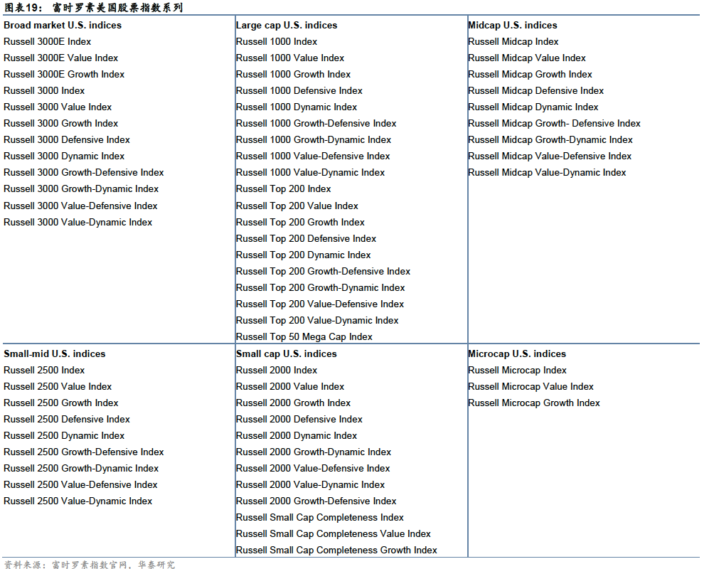 除上述宽基指数外,美股市场还有大量由专业指数提供商设计和维护的股票指数,这些指数既是美股市场的业绩表征,也是ETF等基金产品的跟踪基准。知名指数提供商包括标普道琼斯(S&P Dow Jones)、富时罗素(FTSE Russell)、明晟(MSCI)、证券价格研究中心(GRSP)等。其下细分股票指数涵盖大盘、小盘、中盘、全市场等规模指数;在不同规模内部,又按照风格划分为成长、价值等指数(如大盘价值、小盘成长)。除市值和规模因子外,还有按照行业划分的板块和行业指数。以罗素指数为例,其部分指数系列的构成如下: