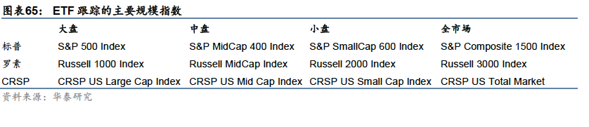中盘、小盘和全市场ETF的跟踪标的则主要集中在三家知名指数公司的开发的规模指数系列产品上,分别是标普系列、罗素系列和CRSP(证券价格研究中心)系列,各个指数系列内部均有大盘、中盘、小盘、全市场的口径划分,编制方式和成分数量各不相同。在混合型宽基内部,以跟踪大盘和全市场的产品为主。