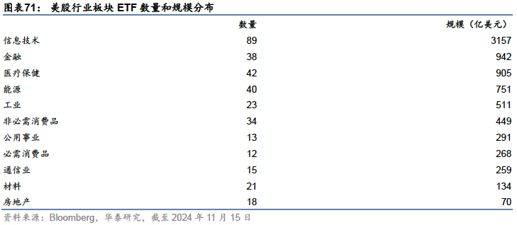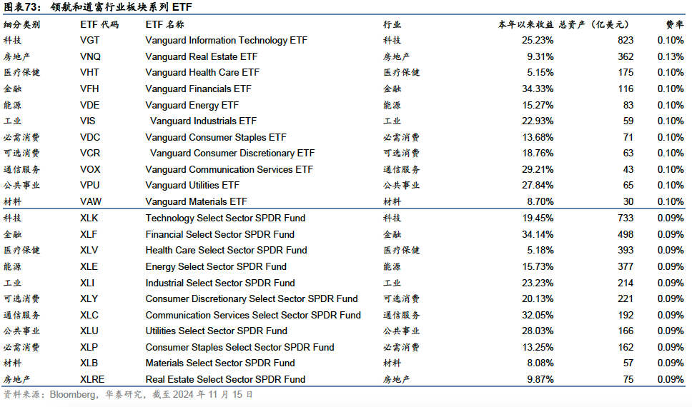 除上述规模较大、受关注度较高的板块外,领航、道富等公司均推出覆盖全部11个行业板块的系列ETF产品,为投资者提供不同行业风险暴露。