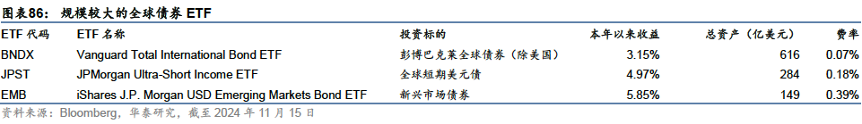 全球债券:投向多地区综合指数,旨在获取全球债券风险敞口 投向海外和全球市场的债券ETF基金共约162只,规模2160亿美元左右,在ETF市场规模占比约2.09%,属于相对小众的投资领域,其中还有一部分投向全球范围内美元债券的基金,持仓上仍以美国债券为主。总体来说,投向海外债券资产的ETF资金较少,单只规模较大的基金主要有BNDX和EMB,分别由领航和贝莱德管理,投向非美全球和新兴市场债券,旨在获得综合性的海外债券风险敞口,不针对某一具体国家或地区。 全球美元债基金中,规模较大的是JPMorgan旗下JPST,主要投向全球范围内短期美元计价债券,持仓结构以美国国债和高等级信用债为主,期限以不足一年的短债为主,本年以来收益4.97%,可作为低风险的现金管理工具。