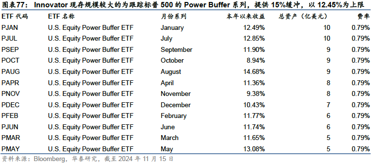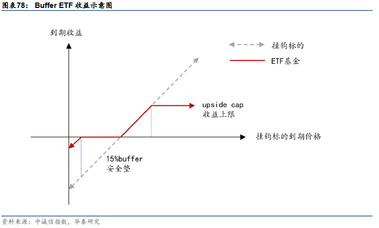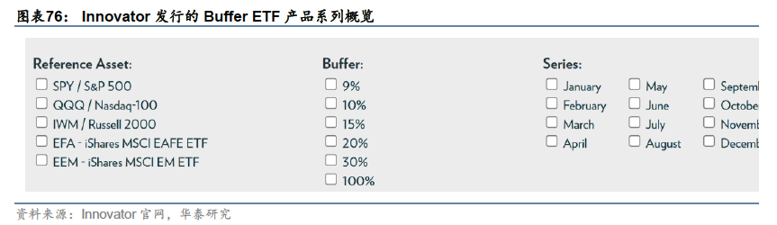 2:Buffer ETF产品:安全垫策略是近年来期权产品中的另一大主流,特别是在2020年-2022年市场波动期间受到投资者关注。这类产品最早由Innovator于2018年推出,由股票和垂直价差策略期权组成,牺牲部分上行收益,通过期权形成下跌保护,以往这类设计多用于结构化产品和保险产品,而Innovator将这种设计思路放在了股票型ETF产品上。Innovator的Buffer ETF系列底层标的包括标普500、纳斯达克100、罗素2000、MSCI全球指数和MSCI新兴市场指数,产品滚动发行,一年到期后产品代码不变,接续下一期,目前,根据其官网统计,Buffer ETF产品共约80只,规模近180元,涉及6个不同程度的缓冲垫以及相应的收益上限,是目前发行期数最多、管理资产规模最大衍生品产品系列。此外,First Trust和贝莱德也发行了类似的下跌保护ETF,凭借资源和品牌与具备先发优势的Innovator展开竞争。
