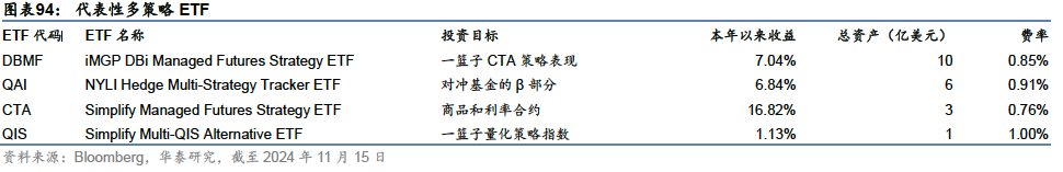 多策略ETF普遍规模较小,但其使用的策略内涵较为丰富,在此我们选取几个有代表性的ETF进行简单介绍。(1)DBMF:为普通投资者提供了一个相对简捷灵活的获取对冲基金敞口的方案。投资于管理期货的对冲基金通常具有较高的投资收益上限,但同时投资风险和资金门槛也较高,且业绩表现并不稳定,对基金筛选的要求很高。DBMF选取一篮子对冲基金,通过因子分析来识别这些基金的风险敞口,并用期货来复制其头寸,旨在获得超越市场平均水平的收益。(2)QAI:跟踪一个基于规则的指数,该指数旨在刻画驱动对冲基金业绩表现的β部分(区别于基金经理投资能力的α),从而获取对冲基金市场整体平均水平的收益;(3)CTA:采用商品和利率合约进行投资,从而保证与股票的低相关性,采用价格趋势、均值回归、carry因子、risk-off等四个核心模型决定期货多空头寸,旨在获取与股市低相关的绝对收益;(4)QIS:采用互换合约,跟踪一篮子量化策略指数的表现,底层的策略指数可能覆盖多种资产类型和投资方案。