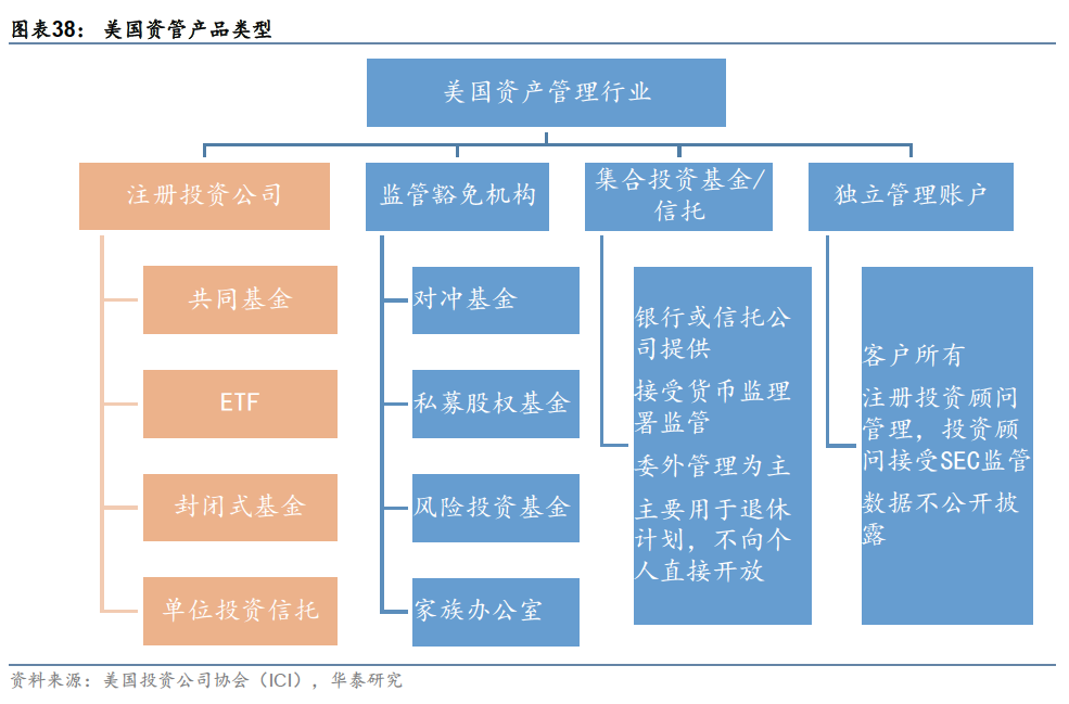丰富的衍生品市场为投资组合和风险管理提供了良好的土壤,专业投资者可以将期货、期权、互换、结构性产品等统一运营,结合股票、债券等基础资产,创造出丰富的交易策略,满足各种各样的投资需求。 02 资产管理行业:ETF成为美国家庭重要投资工具 2023年底公募基金总规模约34万亿美元,以股票型共同基金和ETF为主 美国资产管理行业与国内的资产管理行业划分口径略有不同。按照管理人,美国资管机构可以分为注册投资公司(类似国内口径下的“公募基金”,受SEC监管)、监管豁免机构(类似国内口径下的“私募基金”)、集合投资基金(一般由银行或信托公司提供)以及独立管理账户等四种主要类型。其中,注册投资公司提供的产品又包括共同基金(类似国内口径下的场外开放式基金,不包括ETF)、交易所交易基金(ETF)、封闭式基金和单位投资信托四种类型。截至2023年底,美国注册投资公司(以下简称“美国公募基金”)总资产约33.93万亿美元,同期股票市场规模约49万亿美元,债券市场规模约55.3万亿美元。