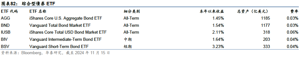 债券ETF中单只规模最大的产品为两个综合型债券ETF,AGG和BND,跟踪彭博巴克莱美国综合债券指数(Bloomberg US Aggregate Index),这是一个综合性债券指数,涵盖多种债券类型和到期期限,是表征美国债券市场的一个旗舰基准指数。由于债券市场类型丰富、数量庞大,非债券专业投资者难以对个券进行详细深入的研究,投资该指数相当于复制了美国一篮子债券的表现,可以作为低成本获取债券市场平均收益的便捷之选。 细分期限的债券产品中,规模较大的为BIV和BSV,均由先锋公司发行,主要投资于短期或中期的债券,品种多元化,以国债和信用债为主。