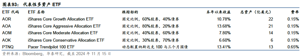 多资产ETF:提供多资产、多策略的风险敞口 除了投向单一资产外,ETF也承担资产配置的功能,进行多元化投资。我们将这部分产品分为多资产和多策略两个类型:多资产类别下,更强调资产类别的多元化,而多策略类型下,更强调投资策略的多元化。这两个部分合计规模约270亿美元,在ETF市场占比约0.26%,以多资产类别为主。 多资产ETF主要在股票、债券之间进行混合配置,投资理念类似国内的“混合型基金”。这一类别下规模较大的代表性产品为iShares旗下固定比例股债配置产品,分别为保守型、适度型、激进型和成长型,按照不同的固定比例配置iShares旗下的核心股票和债券ETF,费率相对较低。2023年以来,贝莱德等机构开始推出目标日期型产品,向养老产品领域扩展,但目前规模还相对较小。 动态配置产品中规模较大的为Pacer Trendpilot 100 ETF,以纳斯达克100为核心标的,通过该指数与其200日移动平均线的相对水平,决定股债配置比例为:(1)100%投向纳斯达克100指数;(2)50%投向纳斯达克100,50%投向3个月美国国债,或(3)100%投向3个月美国国债,体现了一定主动管理的思想,费用高于固定比例配置的产品。