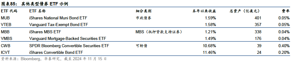市政债、MBS、ABS、可转债在债券ETF市场也有部分产品跟踪,但总体规模相对较小。其中,部分免税主题的市政债在近年来受投资者关注较多,但主要面向本州内部投资者。