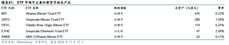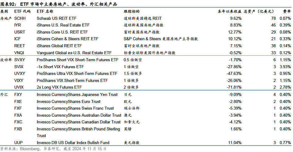 另类资产ETF:加密货币、房地产、波动率、外汇,比特币获资金流入 除股票、债券、商品这三类典型资产外,ETF市场还覆盖加密货币、房地产、波动率、外汇等另类资产,在全部ETF市场规模占比分别为1.10%、0.66%、0.03%、0.02%,合计约1.80%,在投资组合中更多作为支持性品种,提供分散化的风险收益来源,降低组合内部的相关性。 加密货币特别是比特币是近年来美国ETF市场中较为热门的一类产品,美国加密货币类ETF产品规模前5中,有4只跟踪比特币,一只跟踪以太坊,规模最大的是iShares比特币信托 ETF,本年以来资金流入近290亿美元,在所有美国ETF中排名第四,目前存量规模已经超越同品牌iShares旗下的黄金ETF。比特币作为新型资产,其受欢迎程度逐渐逼近甚至有超越黄金等传统资产的趋势。