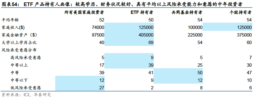 综合上述基金产品规模变化、边际资金流向和销售渠道的分布,近年来美国基金行业呈现出特征鲜明的向ETF投资发展的趋势。从目标人群来看,富裕家庭是美国ETF的主要持有人。相比于持有共同基金、个股的投资者,ETF持有者的家庭收入和家庭金融资产较为充裕,大学以上学历人群占比在所有投资者群体中最高,中等及以上的风险承受意愿较强,平均年龄也更为年轻。总体来看,ETF与较高学历、财务状况较好、具有平均以上风险承受能力和意愿的富裕家庭较为契合。