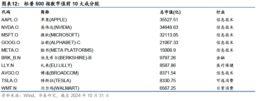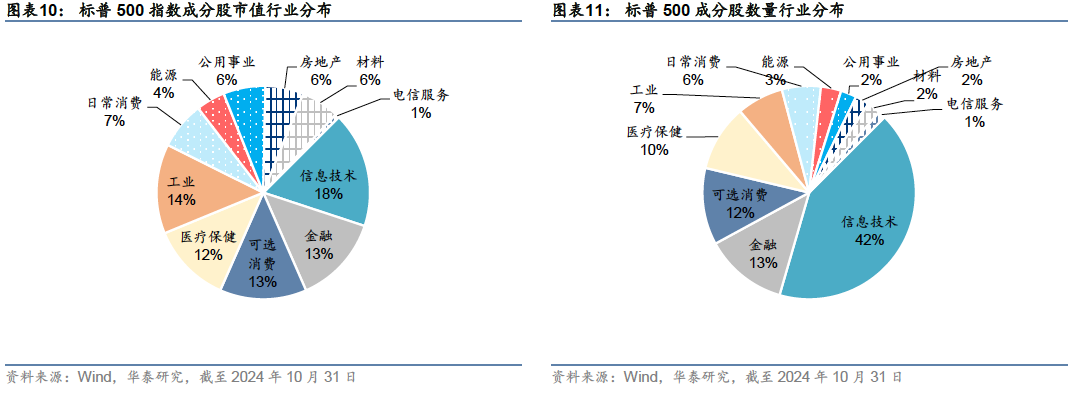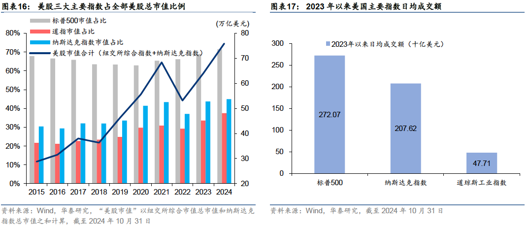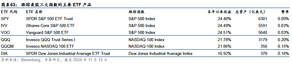 对比三只指数:标普500对全市场的市值覆盖率最高,2023年末对全美股票市值覆盖率超70%,2023年1月-2024年10月,日均成交额在三只指数中最高。行业分布最为全面,对美国整体市场的表征性最强;纳斯达克指数成分股数量最多,对科技行业的代表性较好,是新经济的代表,但成分股数量较多,复制难度较高;道指历史最为悠久,但成分股数量较少,对全市场的表征性不足。美国ETF市场上,标普500是最主要的跟踪标的,截至2024年11月15日,跟踪标普500的ETF管理资产规模超2.2万亿美元,远超跟踪另外两只指数的ETF产品规模。