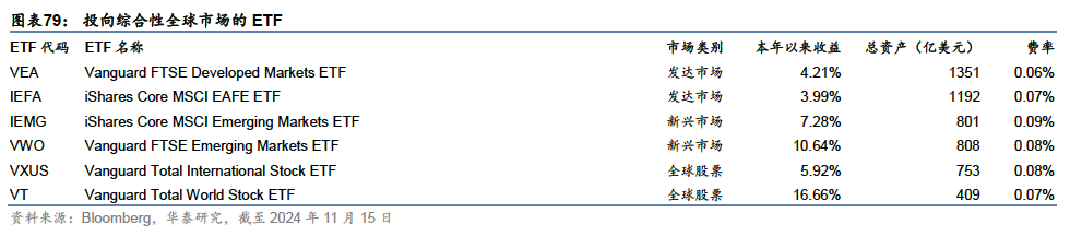 海外股票型ETF:通过美国市场获取全球权益资产风险敞口 投资者可以通过美国市场获取全球权益资产风险敞口。海外股票ETF共约950只,规模约1.47万亿美元,占ETF市场14.27%左右。其中投向综合性国际市场(新兴市场和非美发达市场)的ETF占据主流,规模约1.05万亿美元;投向全球市场(含美国在内)的综合性ETF和行业主题ETF约0.22万亿美元,主要集中在全球矿业、能源、信息技术等主题;其余为投向欧洲、亚太等地区或日本、法国、印度等国家的地域主题ETF,规模约0.2万亿美元。 海外股票ETF中,规模排名靠前的为先锋和贝莱德管理的6只综合性全球权益基金,分别投向非美发达市场、新兴市场和包括美国在内的全球股票市场,在地域上具有较好的代表性和完备性。