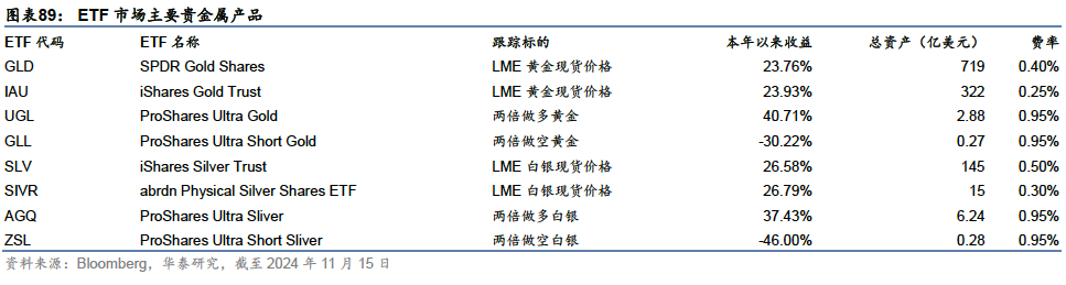 就规模分布来看,跟踪贵金属的ETF占据了商品市场的88%左右,规模较大的两个黄金信托总计约1042亿美元,约占全部商品市场的三分之二,分别由道富和贝莱德管理,SPDR Gold Shares是全球第一个也是迄今规模最大的商品型ETF,跟踪伦敦金现货价格;贝莱德旗下iShares Gold Trust同样跟踪伦敦金价,成立较晚,但费率方面相对更有优势。基金主要通过在LME现货市场持有黄金来跟踪金价,投资者可以通过持有基金份额间接持有黄金。除此之外,ETF市场还提供白银、铂、钯等产品、以及加杠杆或多空不同方向的金、银ETF产品,为投资者提供贵金属多空头寸的实现工具。