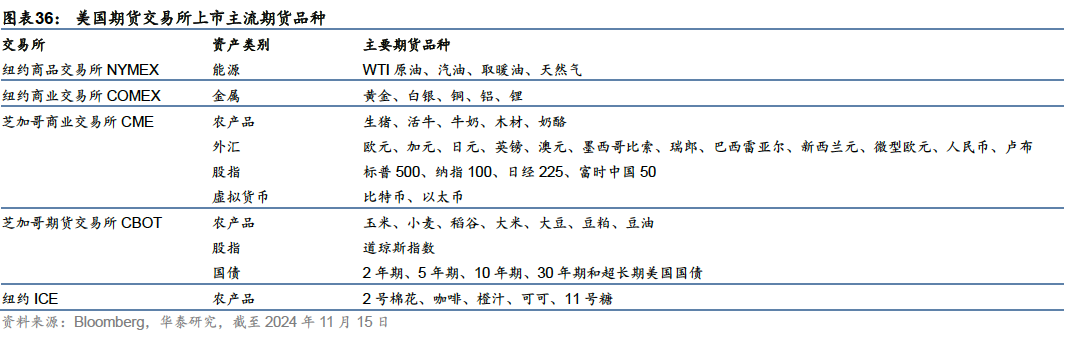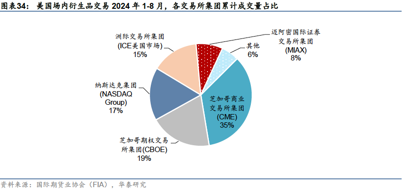 衍生品市场:覆盖股票、利率、能源、金属、农产品等主要期权期货品种 美国的期货市场可追溯至1848年芝加哥商品交易所(CBOT)正式开始期货交易。目前,美国衍生品市场已覆盖金融、能源、农产品等众多品种。在美国衍生品市场发展中,交易所是推进市场创新的重要力量,芝加哥商业交易所集团(CME)在20世纪七八十年代连续推出利率期货、外汇期货、期权等产品,芝加哥期权交易所集团(CBOE)推出了VIX指数,并在此基础上推出VIX期货合约及专业期货交易所,开创衍生品市场的新领域。 场内衍生品交易市场众多,CME、CBOE等四大交易所集团占主导地位 根据合约是否标准化,衍生品市场可分为场内市场与场外市场。美国的场内衍生品交易市场约有32家,其中大部分属于四大交易所集团:芝加哥商业交易所集团(CME)、芝加哥期权交易所集团(CBOE)、洲际交易所集团(ICE美国市场)和纳斯达克集团(NASDAQ Group),另有迈阿密国际证券交易所集团(MIAX)旗下5家交易所;以及另外8家小型交易所。 CME集团交易品种最为广泛,涉及金融、商品等多个类别,CBOE以金融衍生品特别是股指期权为主,纳斯达克、纽交所和MIAX集团旗下的交易所主要进行个股和ETP产品相关交易,ICE期货交易所也有一部分商品衍生品交易,加密货币相关产品则主要在非主流、较小型的交易所如FairX等进行。