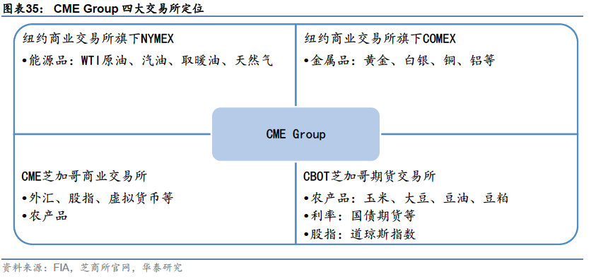 CME交易所集团覆盖主要期货品种,CBOE集团覆盖主要期权品种。 四大交易所集团中,CME集团在期货交易方面占据核心地位,旗下四个交易所分工明确,几乎涵盖了美国绝大部分上市期货品种。芝加哥商业交易所(CME)以金融衍生品为主,特别是股指、外汇、利率期货产品,芝加哥期货交易所(CBOT)主要交易农产品和国债期货,纽约商业交易所旗下NYMEX以能源合约为主, COMEX则以金属合约为主。此外,ICE美国期货交易所也有少量农产品期货交易。