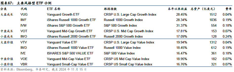 Smart Beta ETF:成长、价值和红利、质量、低波等因子投资工具箱 成长/价值投资:从1929年的大萧条中复苏后,美股市场投资理念趋于成熟,逐渐形成了成长投资与价值投资两大主流。价值投资的核心在于寻找市场价格低于其内在价值的股票,强调长期复利的重要性;成长投资则旨在挖掘具有高增长潜力的股票。在不同的市场环境下,价值投资与成长投资之间存在周期性的循环,构成现代投资理念的核心。各大指数公司将市值因子和成长/价值相结合,形成了诸如大盘成长、小盘价值等组合,ETF提供商也推出跟踪相应指数的产品,我们将各品类内部规模较大的产品示例如下: