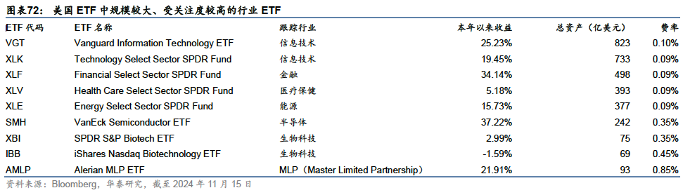 信息技术板块内,半导体ETF今年获得较多关注,范达投资(VanEck)管理的SMH跟踪美国上市半导体25指数,目前规模约242亿美元。医疗保健板块内,生物科技细分行业最受欢迎,贝莱德管理的IBB和道富管理的XBI是规模最大的两只生物科技ETF,跟踪不同的生物科技指数;能源赛道内,MLP主题投资具备节税优势,是近年来美国较受欢迎的高股息品种之一。