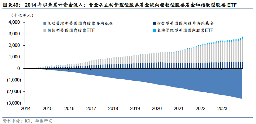新增投资股票基金的资金主要流向指数型股票ETF。2014-2023年,指数型股票共同基金和ETF获得了2.5万亿美元的净流入,而主动管理的股票共同基金净流出2.6万亿美元。被动股票型产品中,ETF相比指数型股票共同基金更受欢迎:指数型股票ETF自2014年以来净资金流入量超过指数型股票共同基金的三倍。