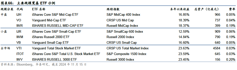 宽基ETF:股票型ETF的基本盘,标普500指数跟踪规模最大 按照市值划分的规模宽基指数是美国ETF最主要的跟踪标的,按照市值大小,可以划分为大盘、中盘、小盘、全市场等四个口径。其中大盘相关产品规模最大,例如,跟踪标普500指数的ETF包揽了全球ETF规模前3,跟踪该指数的全部产品合计规模超2.2万亿美元。纳斯达克指数由于成分股数量较多、部分成分股流动性较差,难以进行跟踪复制,所以该市场的代表性产品以纳斯达克100指数ETF为主;道琼斯工业平均指数仅有一只跟踪产品。跟踪美股三大指数的ETF产品数量并不多,在充分的价格竞争下,仅留若干由头部公司推出的低费率产品,以下为同类产品中规模较大的几只代表性ETF: