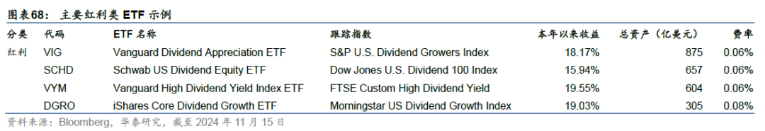 总体来看,根据Bloomberg的统计,美股ETF中,按照跟踪标的的市值来划分,则跟踪大盘指数的ETF规模最大(约62%),其次为全市场(约12%),再次为中小盘(各自占比约6%-7%);若按照成长/价值来划分,混合型ETF占比约60%,成长和价值风格占比各自约20%。 红利投资:1980年代后,美国经历了长期的利率下行,固收类产品的长期收益中枢下降,红利资产能够提供较为稳定的股息分配,具有一定“类固收”的属性;股息在震荡行情下能够为投资收益提供一定的安全垫,在熊市具备更好的抗跌性,且红利资产本身多为具有良好基本面和稳健现金流的优质上市公司,市场竞争力较强。2000年以来,红利成为美股投资的一大主题,目前,市场上规模较大的四只红利ETF普遍具有较低的费率水平,由领航、贝莱德、嘉信理财等头部机构提供。