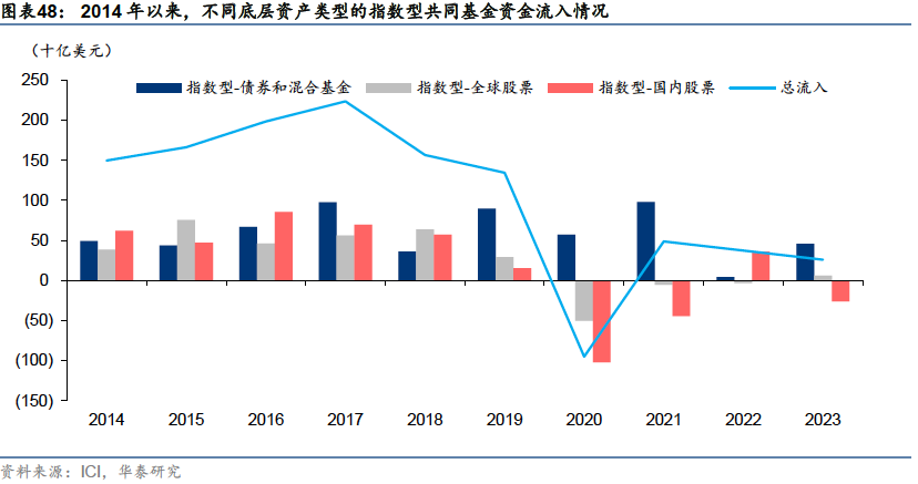 ETF兴起并快速发展,部分资金从共同基金向ETF迁移,特别是在股票投资领域。共同基金中指数型基金产品虽然总体保持了资金净流入(除2020年外),但2017年以来,流入指数型共同基金的资金逐渐减少,且大多流入债券和混合基金,国内股票产品开始出现资金净流出。