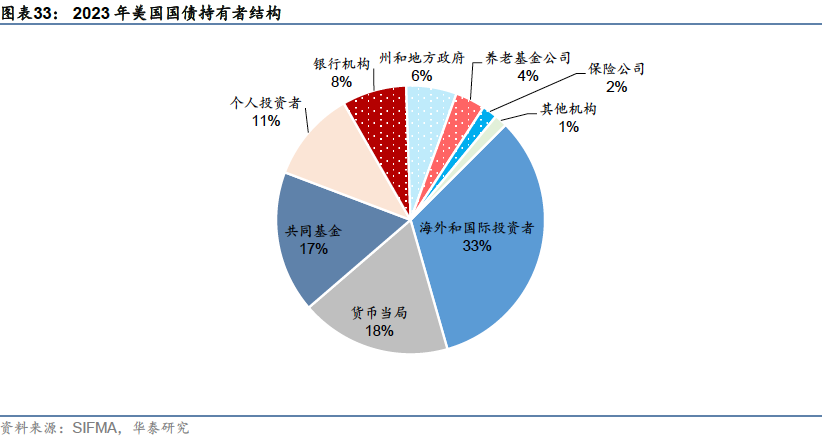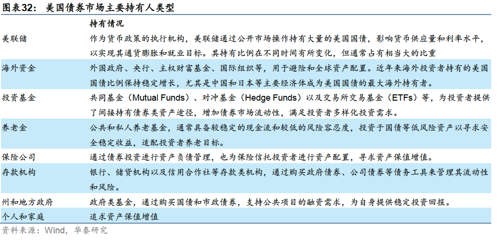 投资者结构多元,国债获外资广泛持有 美国债券市场投资者结构较为多元化,境内投资者主要包括货币当局(即美联储)、投资机构(养老金、共同基金、银行、保险、信托等)、有投资需求的家庭和个人等;另外,美国国债通常被视作良好的避险资产,因此,除美国本土投资者之外,外资也是美国债券市场的主要参与者之一。具体来看,美国债券市场投资者主要包括货币当局、外资、投资基金、养老金等。国债主要持有者按照持有份额占比依次为海外和机构投资者、美联储和共同基金。