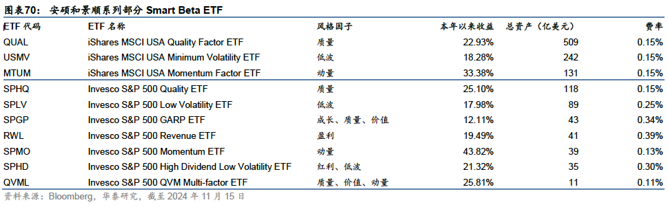 更广泛的因子投资:成长、价值、红利等经典投资理念的本质在于识别长期稳定的收益驱动因素,进行积极资产管理。而因子投资则进一步将这些直观的投资风格系统化、规则化,并通过透明度高的策略来实现对潜在超额回报的有效追踪。随着因子研究的不断深入,学术界已经识别出超过400个不同的因子,因子投资成为了投资者工具箱中不可或缺的一部分。除上述三个因子外,美股ETF市场还有一系列追踪质量、低波动、动量等风格因子的Smart Beta ETF产品,高精度刻画风险敞口,为普通投资者提供了更加多样化和精细化的低成本投资工具。