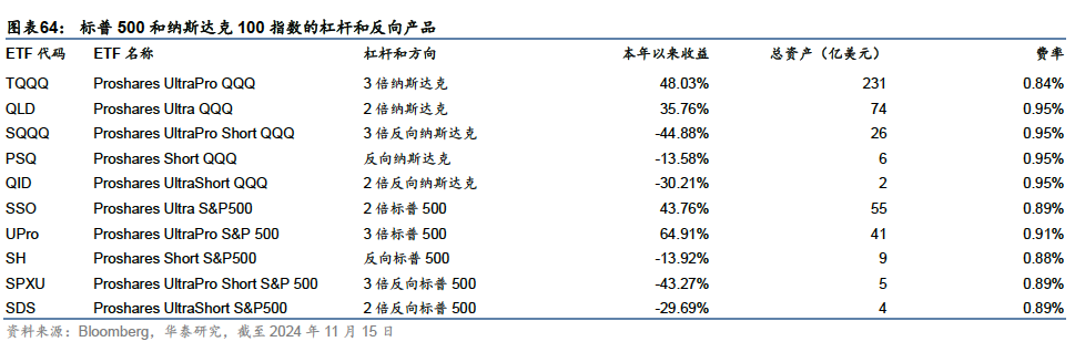 除了复制指数多头表现外,ETF市场还有加杠杆或做空指数的产品,为投资者提供不同风险收益属性的投资选择。例如,Proshares公司旗下跟踪标普500、纳斯达克100指数的产品均有多倍杠杆、多空不同方向的选项,三倍做多标普500ETF本年以来收益超60%。美国ETF市场的杠杆和方向产品不仅覆盖大盘宽基,也覆盖行业板块、个股、国债、商品、比特币等不同类型,典型标的包括标普500、纳斯达克指数、半导体等龙头行业、英伟达等龙头个股、国债、黄金、油气等,总计约264只,规模1268亿美元,底层标的以宽基股票为主。