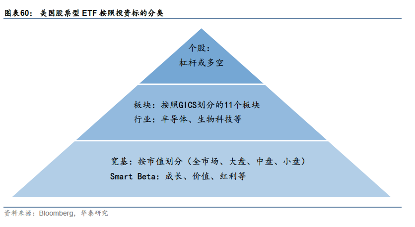 规模排名前30的ETF均为被动产品,以股票为主、债券商品相对较少。股票内部,跟踪宽基指数的规模最大,大盘成长风格占主流;债券类ETF中规模最大的为两只综合型ETF和一只长期国债ETF;海外五只投向多地区的综合股票ETF和综合债券ETF入选,商品内部黄金ETF规模较大。整体来看,宽基被动投资占主流。以下,我们按照上述底层资产分类,对各个大类内部的细分市场结构和典型ETF产品进行更详细的介绍。 股票型ETF:低成本、高精度刻画风险敞口,近年来期权策略受关注 美国股票ETF在全部ETF中占比最高,约1600多只,规模6.68万亿美元,构成了ETF市场的基石。股票型ETF内部,又呈现出“金字塔”状结构: Ø金字塔的底部为大量规模宽基ETF和Smart Beta ETF。宽基ETF主要跟踪标普500、纳斯达克100、罗素2000等指数,旨在获取市场平均收益。在宽基基础上开发的Smart Beta ETF,引入因子投资思想,在市场平均收益基础上获取因子收益。宽基和Smart Beta产品在美国股票型ETF中占比约87%; Ø中层为部分行业板块ETF产品,旨在跟踪某个特定的行业或板块,获取行业超额。占比相对较少,约12%; Ø占比最小的是跟踪单只或若干只股票的个股或投资组合产品,规模占比不多,但策略类型较为丰富,如“两倍做多英伟达”等产品,规模约占美国股票ETF的1%。 由于美股市场整体有效性较高,能长期获得超额收益的行业和个股并不多见,故ETF市场还是以宽基和smart beta策略为主。