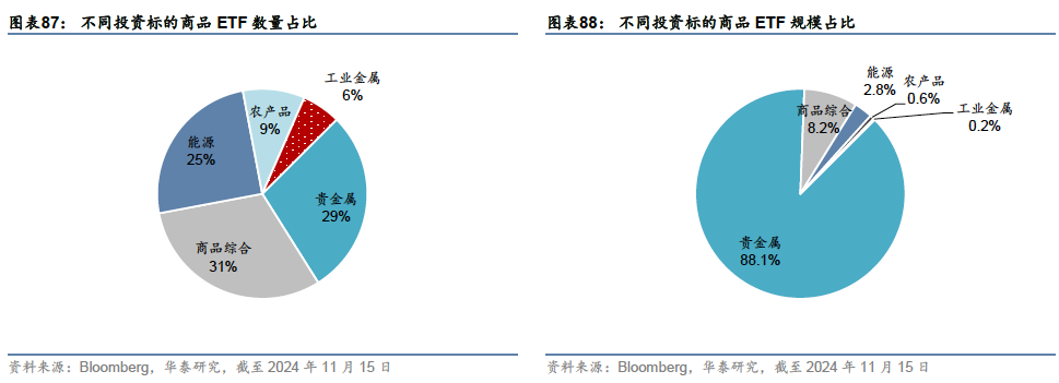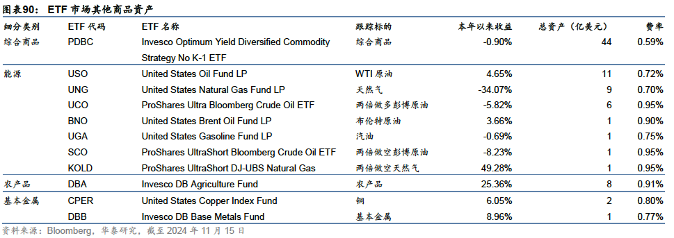 跟踪综合商品市场的产品约占据商品ETF市场8%左右的规模,适用于对具体品种没有观点,但希望通过ETF获取商品大类资产敞口的投资者;细分品种中,能源品类相关ETF较多,涵盖WTI原油、布伦特原油、汽油、天然气等多个品种,原油还包括多空双向产品,可以从原油下行中获利。其他板块如农产品和基本金属,则以跟踪该板块整体走势的产品为主。总而言之,商品ETF在整体市场属于相对小众的产品,但为需要进行原油、黄金、铜等主流商品资产交易的投资者提供了便捷的投资途径。