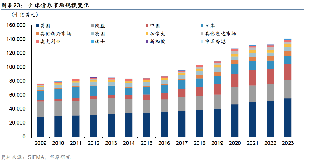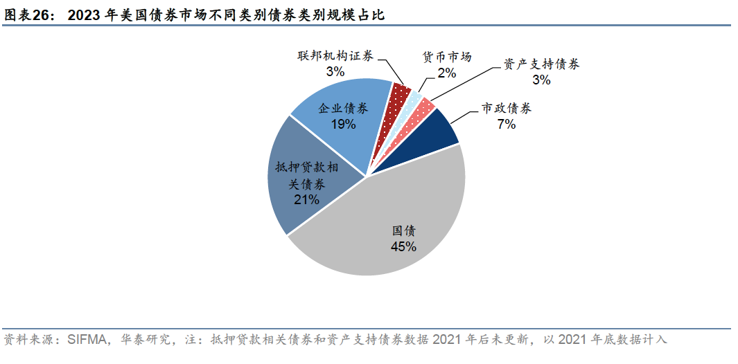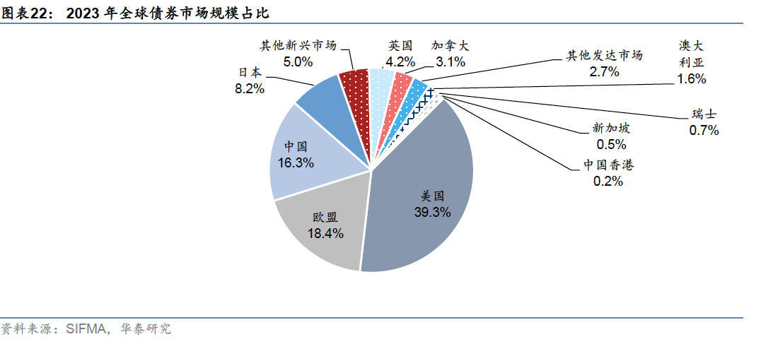 债券市场:全球规模最大的债券市场,品种丰富,交易活跃 美国是全球债券市场中规模最大的市场。截至2023年末,全球债券市场总规模约140.7万亿美元,其中美国债券市场规模约为55.3万亿美元,占比39.3%。美国债券市场品种丰富,交易活跃,参与者结构多元,外资占比较高,是全球资本市场的重要组成部分。
