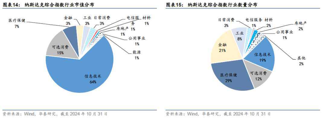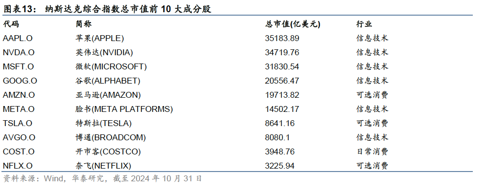 (3) 纳斯达克综合指数:纳斯达克交易所上市公司,科技行业的代表 1960年代初,美国股票市场出现了成长股的投资热潮,信息技术、电子和通信等科技板块成为股票市场中热度最高的行业板块。1971年,纳斯达克交易所成立,服务于不符合纽交所上市规则的新兴行业公司,同时推出纳斯达克综合指数(NASDAQ Composite Index,IXIC.GI,简称“纳斯达克指数”),表征纳斯达克市场上市公司的发展。指数成分股包含了纳斯达克交易所全部境内和国际上市公司,涵盖所有新技术行业,包括软件和计算机、电信、生物技术等。随着科技行业的崛起,纳斯达克指数在90年代互联网泡沫期间获得了较大的关注,被视为科技领域的代表性指数。 纳斯达克指数由纳斯达克公司进行维护,包含纳斯达克交易所上市的全部股票(含境外公司),截至2024年10月31日,成分股约3436只,总市值约34.8万亿美元,占全部美国股票市场的40%左右,行业分布以信息技术为绝对主导,高科技与成长性特征鲜明,许多知名的科技巨头,如苹果、谷歌母公司Alphabet、微软等,都是纳斯达克的成分股,纳斯达克交易所不仅包含美国境内上市的股票,也允许海外符合条件的公司上市并纳入指数,成为衡量全球科技股表现的重要指标。