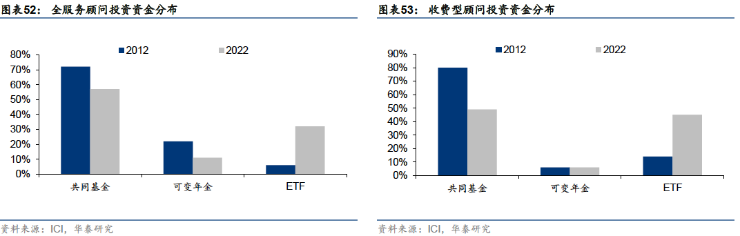 专业投资顾问更青睐ETF:从2012年到2022年,无论是全服务顾问还是收费型顾问,其管理的资金中,ETF的占比都有了显著的提升,而共同基金和可变年金的占比则有所下降。这一趋势在收费型顾问的投资中体现的尤为明显。相比全服务顾问,收费型顾问通过客户支付的费用获得报酬,不受特定产品提供商的约束,通常与客户利益具有更好的一致性。在专业投资顾问为客户打理的资产中,也出现了从共同基金向ETF迁移的趋势。