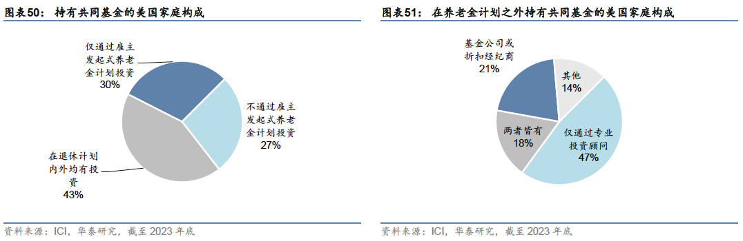 主动投资领域也出现了从共同基金向ETF转换的趋势。随着ETF投资的兴起,将共同基金转换为ETF成为基金公司参与ETF投资的一个主要模式。根据中证指数公司在《主动管理ETF发展年度报告(2023)》中的统计,自2021年美国首次出现共同基金转换为主动管理ETF以来,共计40只共同基金转换为主动管理ETF,截至2023年底,由该模式带来的主动管理ETF存量规模已超过1000亿美元。主动管理型ETF以指数增强类权益ETF为主,在保留指数ETF费率较低、透明度高、流动性好等优势的基础上,加入红利、低波动、多因子选股等策略,具备更多获取alpha收益的潜力。近年来,主动管理ETF规模大幅增长,逐渐成为ETF市场一大吸金主力,2023年,主动管理ETF资金流入占ETF全市场资金流入的比重为24%。 共同基金销售渠道以养老金账户为主:从当前美国家庭购入共同基金的主要方式来看,雇主发起式养老计划是当前共同基金最主要的销售渠道。截至2023年末,有73%的美国家庭通过雇主发起式养老计划购买共同基金,而仅从雇主发起式养老计划购买共同基金的家庭占比达30%。在养老计划以外的途径持有共同基金的家庭中,大部分(约65%)通过专业投资顾问进行共同基金投资,仅有小部分(21%)仅通过基金公司的直销渠道或者折扣经纪商等渠道直接购买基金。总体上,共同基金的销售渠道中,养老金账户>专业投资顾问>基金公司和折扣经纪商。
