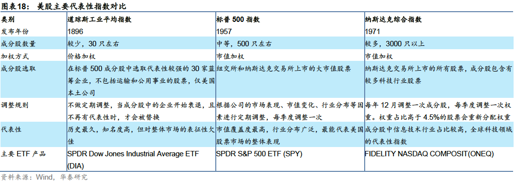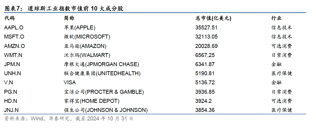 三大代表性股票指数:标普500、纳斯达克、道琼斯工业指数 美股是股票指数的发源地。目前,美国市场有三大代表性指数,包括道琼斯工业平均指数(Dow Jones Industrial Average, DJIA)、标准普尔500指数(S&P 500 Index, SP500)和纳斯达克综合指数(Nasdaq Composite Index, IXIC)。道琼斯工业指数成分股主要集中在能源、金融等传统大票,标普500指数囊括了500家蓝筹上市企业,行业分布较为广泛,纳斯达克指数是美国高科技企业的代表。指数的发展反映了美国股市的不断演变和经济结构的调整,从早期的工业主导,到消费主义的兴起,再到科技行业的繁荣。 (1) 道琼斯工业平均指数:美国第一只综合性股票指数,反映工业行业发展 道琼斯工业平均指数(DJI.GI,也称道琼斯工业指数,以下简称“道指”)是4组道琼斯股票价格平均指数中的一组,最早于1896年由查尔斯·亨利·道推出,纳入12家工业行业股票,涵盖当时美国工业的主要领域如铁路、烟草、石油等,采用价格加权平均,旨在表征工业行业的发展,是美国最早的综合性股票指数。指数推出后,股市有了定量的观察分析指标,美国股市作为经济晴雨表的作用逐渐被强化。指数目前由标普道琼斯指数公司(S&P Dow Jones Indices)维护,包含30只成分股,均为美国境内上市的本土公司,覆盖信息技术、金融、消费等多个行业,截至2024年10月31日,总市值约19.3万亿美元,覆盖美国境内上市公司总市值的30%左右。成分股的变更没有固定的调整频率,而是由委员会按需调整,综合考虑投资者关注度、行业代表性等因素,从标普500股票池中选取对美国股市最具代表性和影响力的三十家公司。