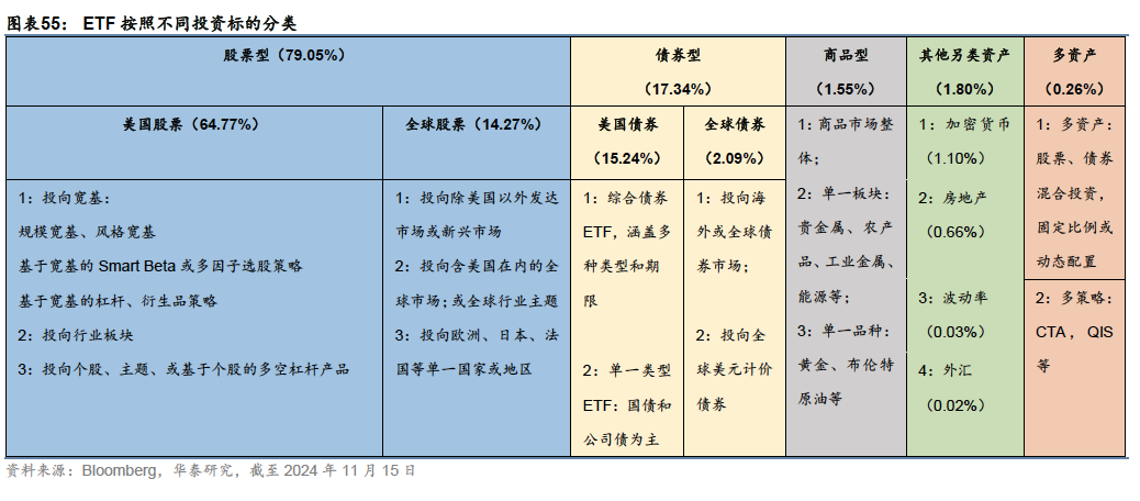 03 ETF市场全景:宽基股票为基石,“万物”皆可ETF 根据Bloomberg的数据,截至2024年11月15日,美国ETF市场上约有3700多只ETF产品,总计规模约10.31万亿美元,覆盖的底层资产和策略类型较为广泛:从传统的股票、债券、商品、外汇等资产,到加密货币、波动率、房地产等另类资产,既有对单一类别资产的投资,也有涉及多资产、多策略的混合投资;从地域类型来看,美国ETF市场不仅提供对美国资产的风险敞口,也提供对海外的股票、债券等全球资产的风险敞口;从管理方式来看,被动指数化产品占主导,但近年来新发ETF中主动管理产品也逐渐增加;从策略类型来看,早期产品以传统的成长、价值风格和红利等smart beta策略为主,新发产品逐渐向多因子、期权等策略类型扩容。 按照ETF持有的主要底层资产,3700多只ETF产品可划分为股票、债券、商品、其他另类资产和多资产五个大类。美国境内的股票产品无论是规模还是数量占比都处于绝对主导地位,其次为全球股票和美国债券,这三类资产合计占比近九成。全球债券、商品、其他另类资产和多资产ETF虽然种类繁多,但总体市场份额相对较小,在投资组合中,更多起到分散风险收益来源、降低相关性的作用。