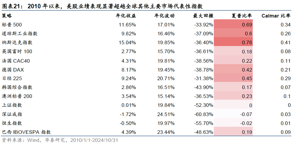 在高科技产业的拉动、机构投资者的引领下,美股市场业绩表现居于全球前列,2010年以来美股业绩表现显著超越其他主要市场,特别是纳斯达克指数以15%以上的年化收益率居全球主要股票市场首位。