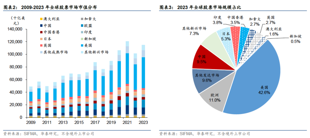 01 资本市场现状:股市和债市规模居全球首位,衍生品类型丰富 现代资本市场最早起源于荷兰和英国,第一次世界大战以后,美国的纽约证券交易所后来居上,超越伦敦成为世界上最大、最重要的证券交易市场。根据美国证券业和金融市场协会(Securities Industry and Financial Markets Association,以下简称SIFMA)的统计,2023年,美国股票市场规模约49万亿美元,占全球股票市值的42.6%;债券规模约55.3万亿美元,在全球债券市场占比约39.3%。衍生品市场由四大交易所集团主导,分工明确,品类丰富,股指、期货、利率等多个衍生品合约成交量居于全球前列。 股票市场:2023年底市值约49万亿美元,占全球股票市值42.6% 美国股票市场是全球规模最大的股票市场。2023年,全球股票市场规模约115万亿美元,其中,美国境内公司发行股票总规模约49万亿美元,占全球股票市值约42.6%,且2009-2023年,绝对市值和在全球的占比均呈上升趋势。二级市场交易活跃,2023年美国股票市场日均成交额约5146亿美元。