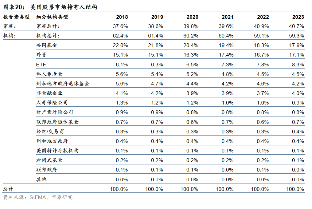上述指数中,标普和罗素系列规模指数以及标普行业系列指数均有较多ETF资金跟踪,代表性产品包括贝莱德基金旗下iShares系列ETF(iShares Core S&P 500 ETF、iShares Core S&P Mid-Cap ETF、iShares Core S&P Small-Cap ETF等)以及道富环球旗下的标普500行业精选系列ETF。 养老金和共同基金促进美股投资者机构化,是美股关键引领力量 美股由机构投资者占主导,截至2023年,个人和机构持股占比分别为40%和60%左右,2018年-2023年,个人投资者即家庭直接持股比例稳定在40%左右。机构投资者则包括共同基金、ETF、封闭式基金、对冲基金、私募股权基金等资产管理机构,养老基金与保险基金,以及政府、银行、非金融企业、非盈利组织等。外资也是重要的组成部分,海外投资者持有美股的比例约15%-17%。共同基金直接持股比例维持在20%左右,占国内专业机构近一半份额,是美股的关键引领力量。其次是ETF、养老基金与退休基金。