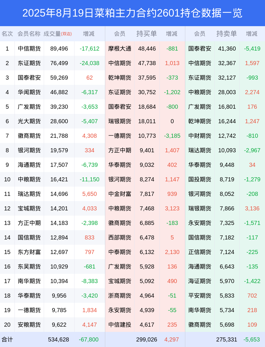 新浪期货 根据交易所数据,截至8月19日收盘主力合约菜粕2601,涨跌+1.01%,成交量40.82万手,持仓数据显示前20席位呈现净多,差额头寸为23695手。