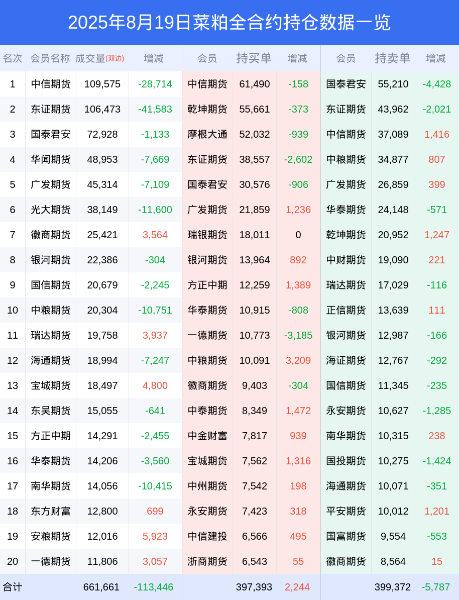 菜粕期货全合约总计成交51.88万手,比上一日减少11.93万手。全合约前20席位多头持仓47.01万手,比上一日增加5777手。全合约前20席位空头持仓46.08万手,比上一日增加27手。