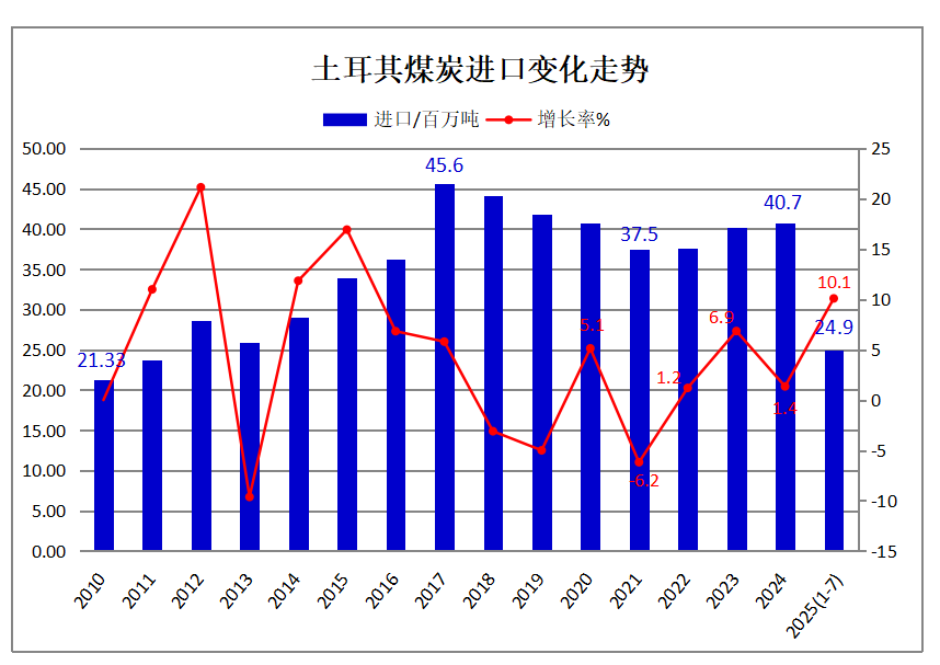 据土耳其外贸统计数据显示,2025年1-7月,土耳其煤炭进口量累计为2491.05万吨,较上年同期增长10.1%。