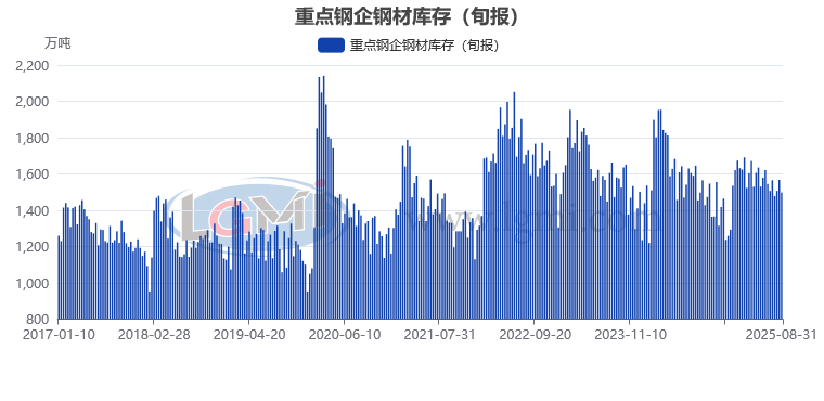 据中国钢铁工业协会统计数据显示,2025年8月下旬重点钢铁企业钢材库存量为1498万吨,旬环比减少69万吨,下降4.4%;比上月同旬增加20万吨,上升1.4%;比去年同旬增加44万吨,上升3.0%。