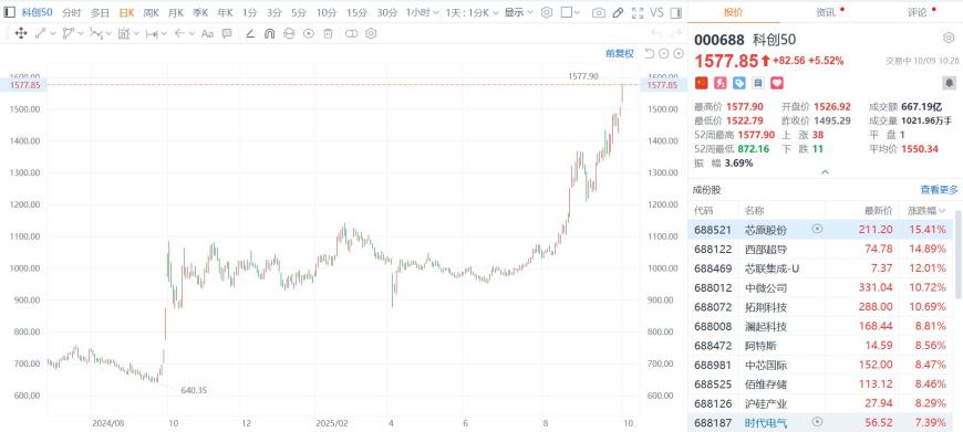 科创50指数涨幅扩大至超5%。中芯国际、华虹公司、江波龙、灿芯股份、芯联集成等多只芯片股创历史新高。芯原股份涨超15%,西部超导涨超14%,中微公司涨超10%。