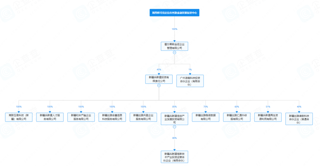经企查查数据股权穿透后可见,新疆兵新建合伙由新疆兵新建投资有限责任公司(下称“兵新建投资”)间接控制,由四师金促中心实际控制(总持股比例为30.6%)。