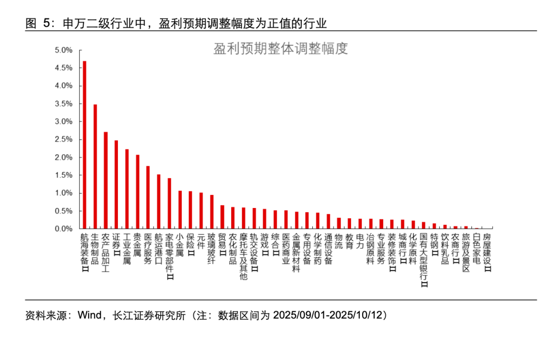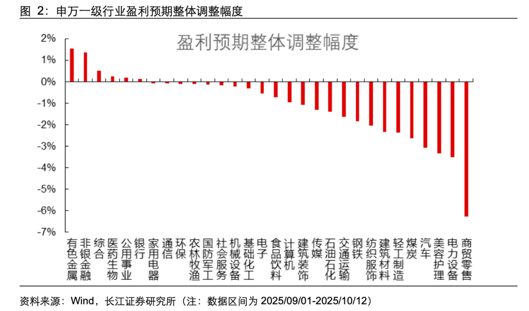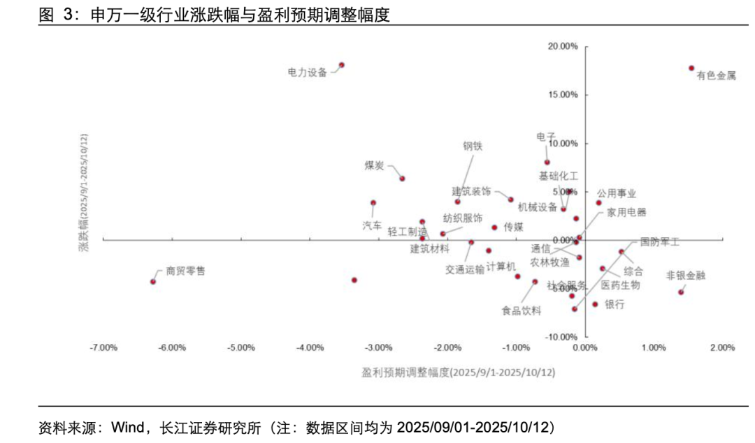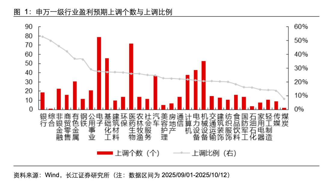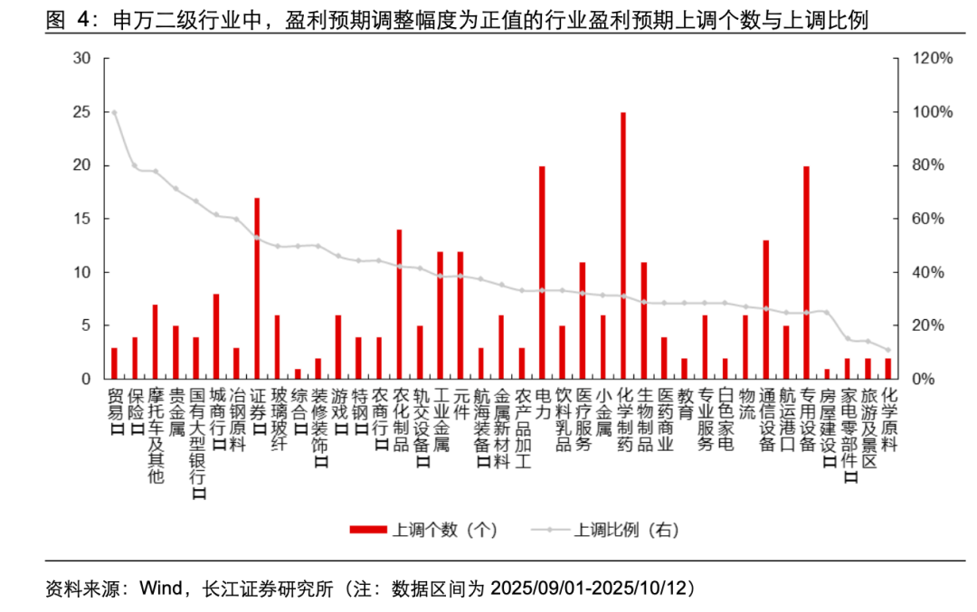 申万一级行业层面,有色金属、非银金融、综合、医药生物、公用事业与银行盈利预期整体上调幅度较高。2025 年 9 月 1 日至 2025 年 10 月 12日,银行、综合、非银金融与商贸零售等行业盈利预期上调比例较高,分别为 52.8%、50.0%、46.0%与 42.1%。电子、医药生物、基础化工与机械设备等行业盈利预期上调个数较高,分别为 79、72、56 与 53 个。盈利预期整体调整幅度上,有色金属、非银金融、综合、医药生物、公用事业与银行盈利预期整体上调幅度较高,分别为 1.5%、1.4%、0.5%、0.2%、0.2%与 0.1%。