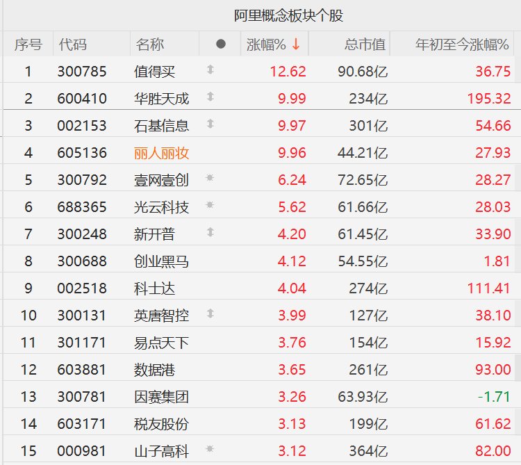 11月18日,A股市场阿里巴巴概念股走强,其中,值得买涨超12%,华胜天成、石基信息、丽人丽妆涨停,壹网壹创涨超6%,光云科技涨超5%,新开普、创业黑马、科士达涨超4%,英唐智控、易点天下、数据港、因赛集团、税友股份、山子高科涨超3%。